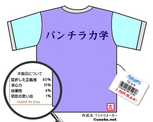 脳内なんちゃら。全部本名でやりました。 人気でずっと使えなかったけど、最近こっちは使えるように。 ってか何この微妙な思考は。 パンチラ力学て・・・。 初恋の思い出が1%ってのが良いね(笑) あと自分の名前が表示されるやつも↓ ○○○○高校(○の中は名前) 校訓 早飯・美人・確変 生徒数 男子102名 女子396名 計498名 データ 偏差値54 <出身者職業ベスト3> 演歌歌手・ホスト・キャバクラ嬢 <主な留学先> ハンガリー・フィンランド・タジキスタン 進路 <昨年度> 大学進学率21.1% 就職率59.8% 大学105名(四年制72名 短期33名) 専修・各種学校54名 民間就職127名 公務員171名 家事・その他41名 ※校訓と出身者の職業が妙にマッチしてる(笑) ○○○○市(○の中は名前) 人口 【総人口】215,691人 【世帯数】56,079 【男性】106,919人 【女性】108,772人 各種データ 面積623平方km / 人口密度346.2人/平方km 市民の平均所得490万円 / 昨年出生数386人 死亡数1,249人 平均寿命84.5歳 / 失業率4.2% / 名産品思春期まんじゅう 市の花カキツバタ / 市の鳥カモメ 1日の救急車出動数62回 / 下水道普及率88.1% 発生事件ベスト3 ヅラ疑惑 寸借詐欺 ひき逃げ 住民の声 頭が弱いからどうしたって?(58歳 建築家) スプーン曲げの件は絶対乗り越えるぞ!(26歳 写真家) 何かと生活しやすい町です(59歳 ジャーナリスト) ※住民が意味不明。名産品もかなり気になる。 BGM:風の谷のナウシカ/坂本龍一 + 嶺川貴子 PR 2007/09/20(Thu) 01:32:53
